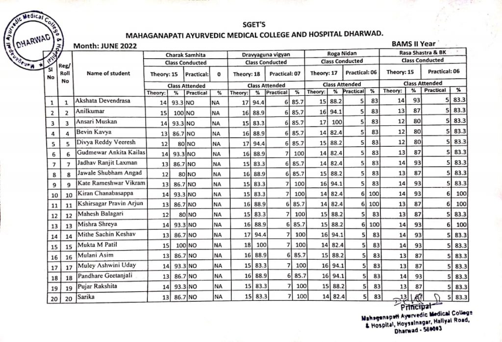 BAMS 2nd Year Students Attendance report for the month of June 2022