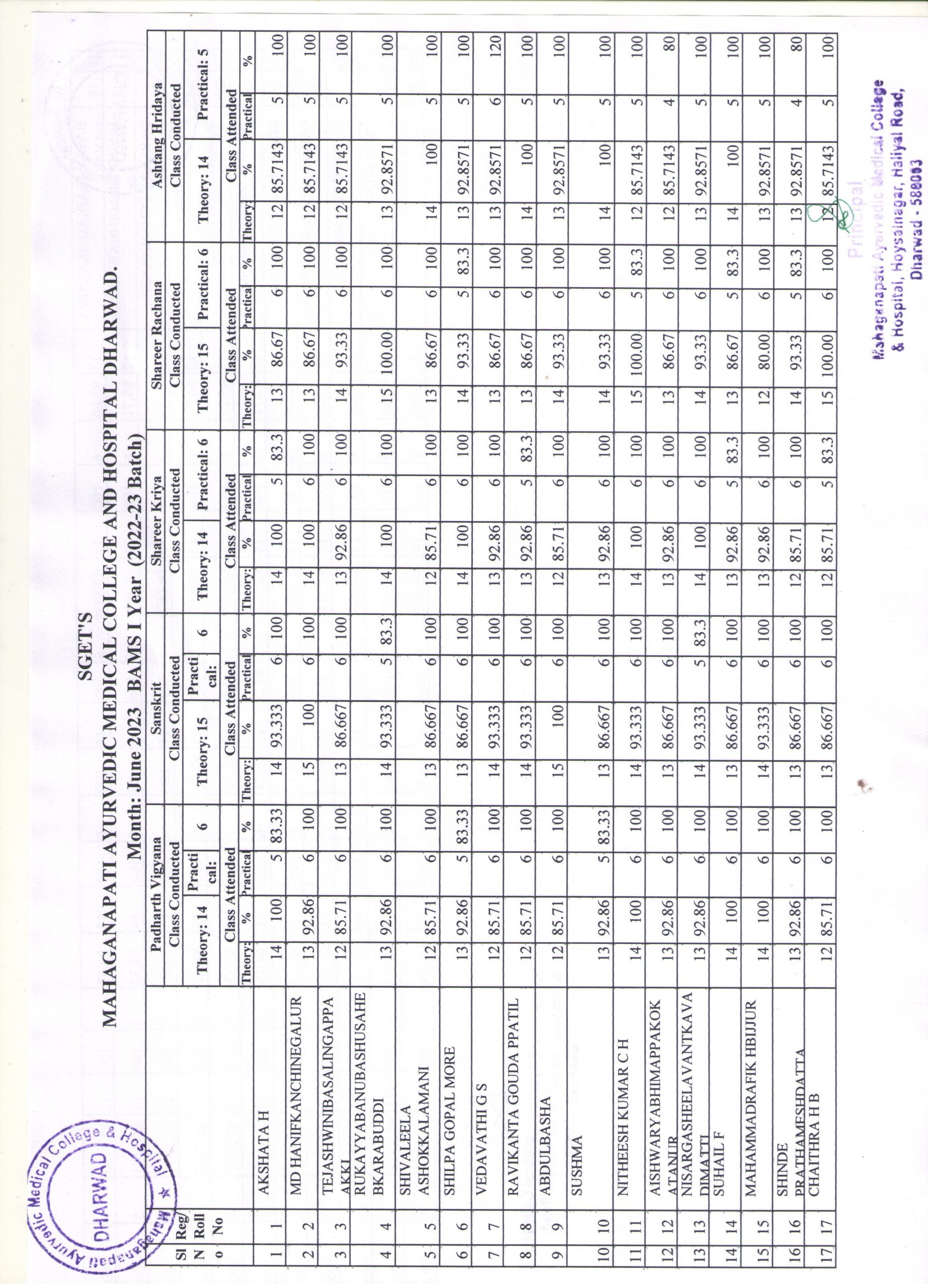 BAMS I Year (2022-23) Batch Attendance Report for the month of June 2023