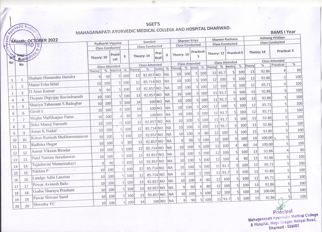 BAMS I Year students attendance report for the month of October 2022