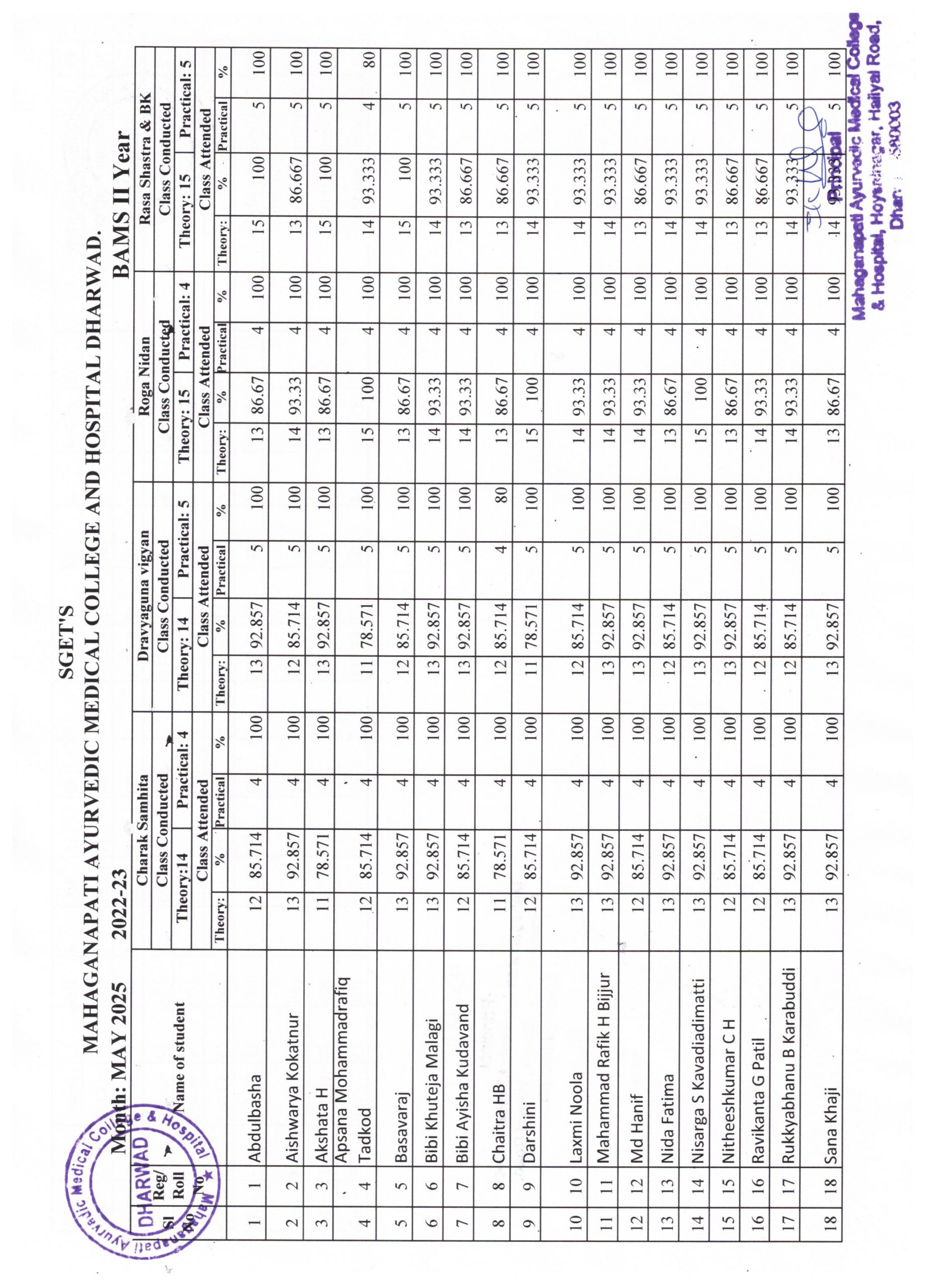 BAMS II Year (2022-23) students attendance report for the month of May 2025