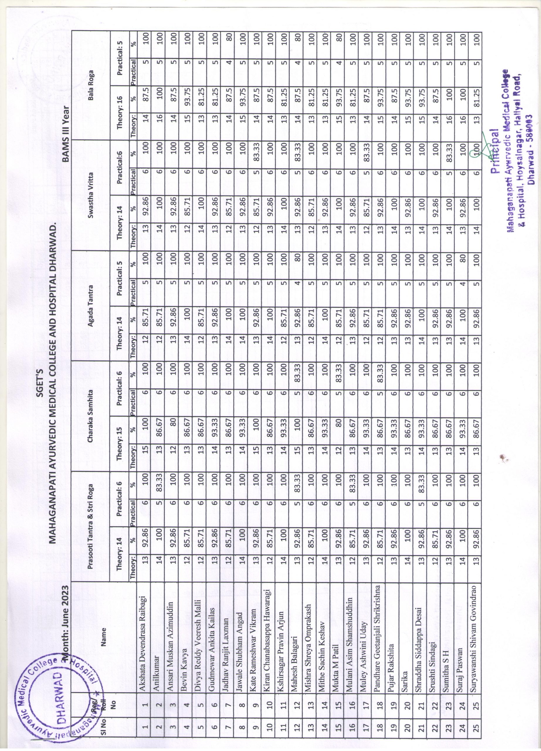 BAMS III Year Attendance Report for the month of June 2023