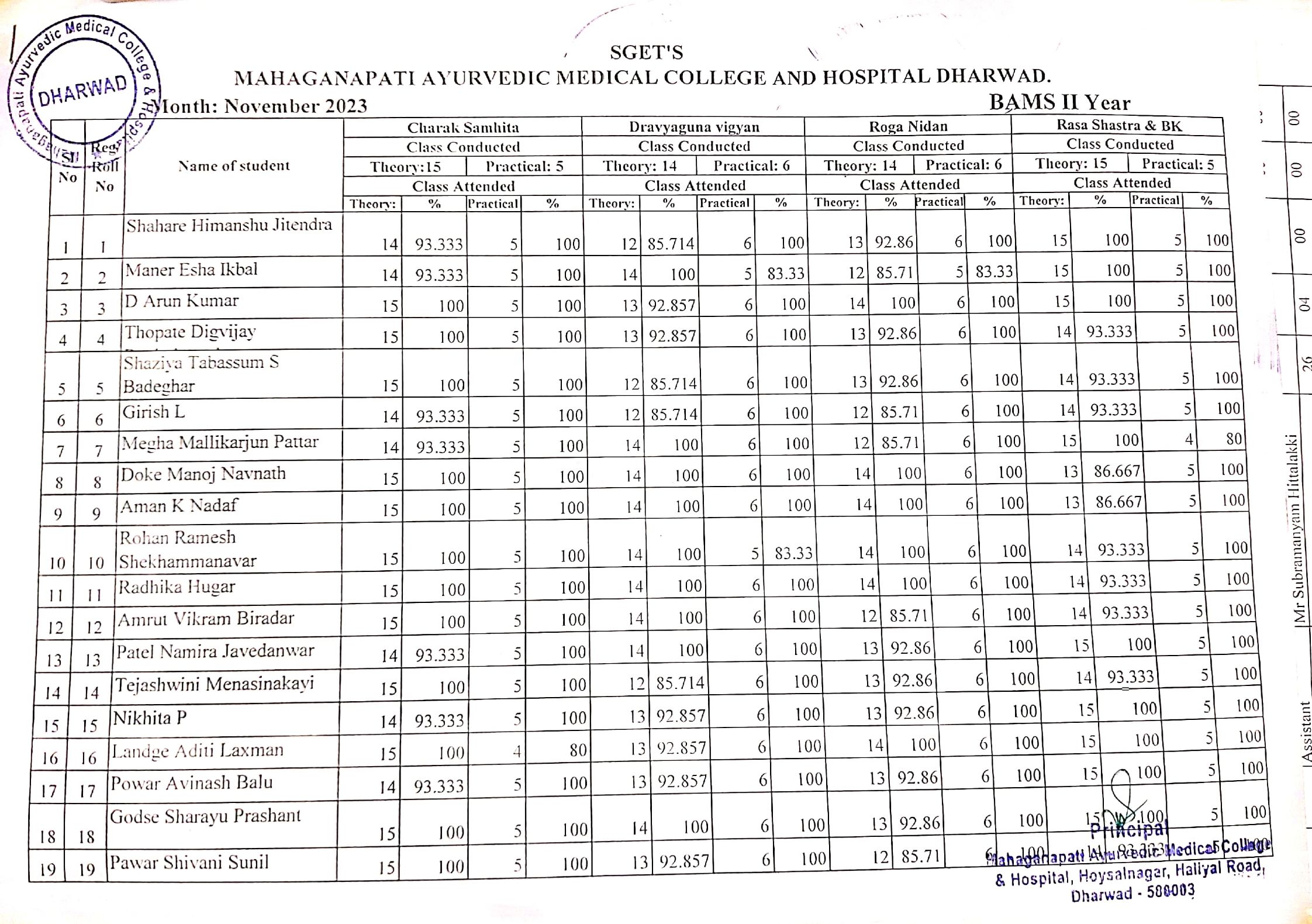 BAMS IIND Year students attendance report for the month of NOVEMBER 2023