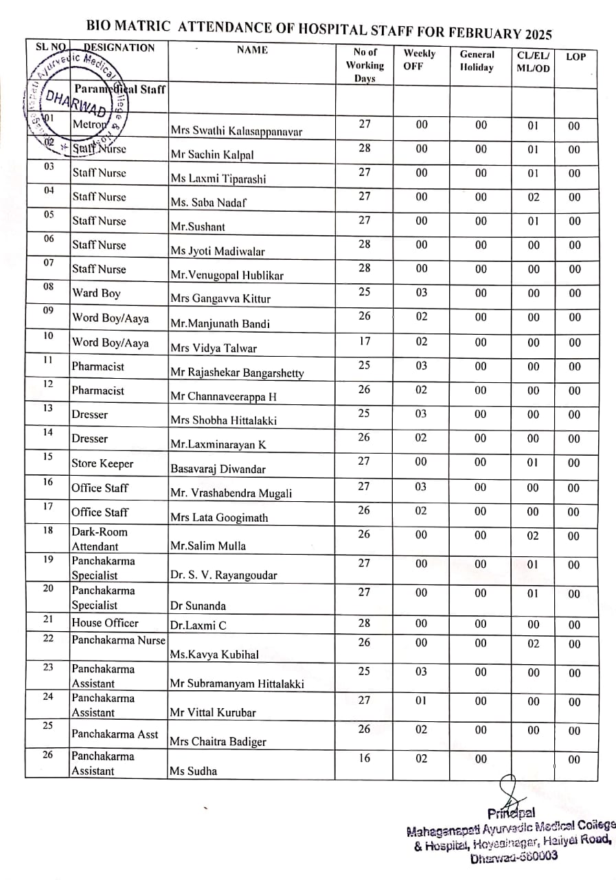 Hospital staff attendance for the month of February 2025