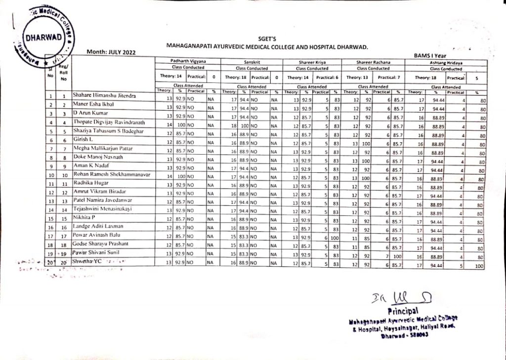 I Year BAMS Students Attendance report for the month of July 2022