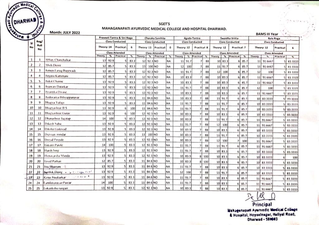 III Year BAMS Students Attendance report for the month of July 2022