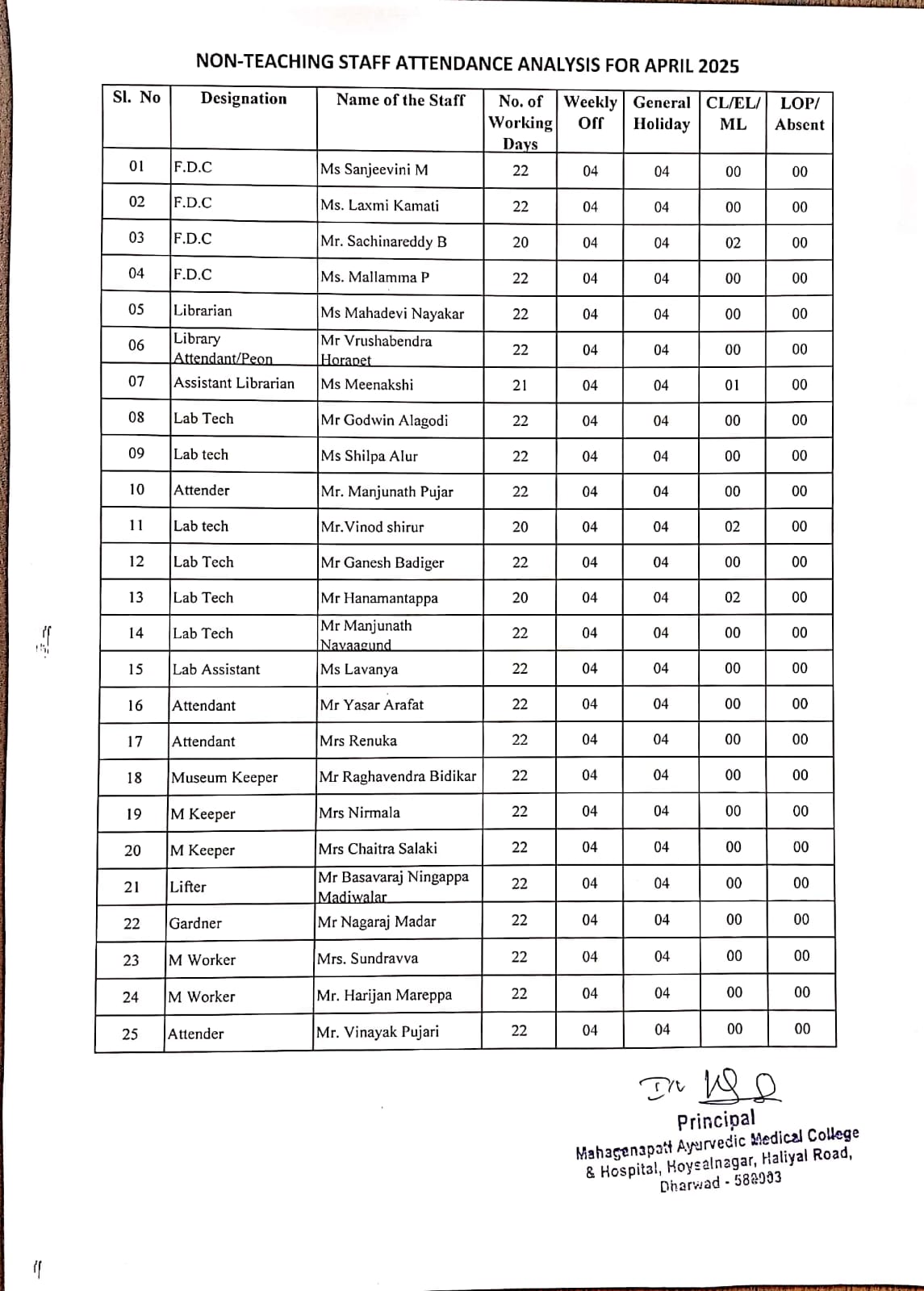 Non Teaching Staff Attendance for the month of April 2025