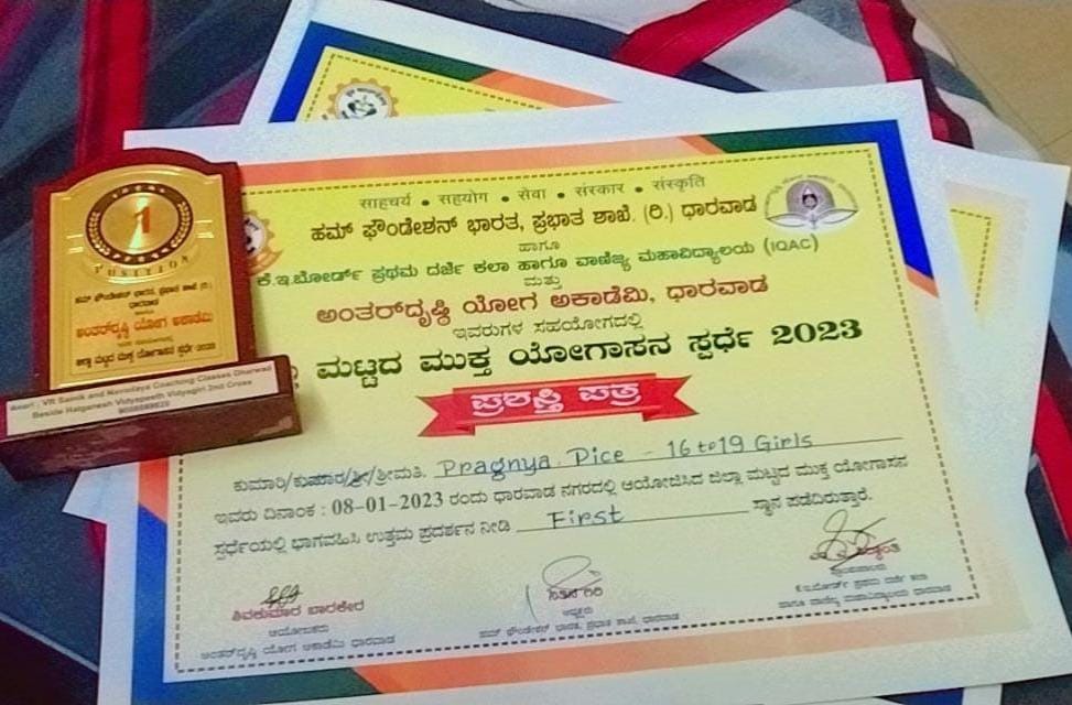 09 Jan 2023 Awards and Achievements Our II Year BAMS Student Miss.Pradnya Pise got 1st Prize in District level Yoga Competition 2023 held on 08-01-2023 at K.E.Board College campus Dharwad Download