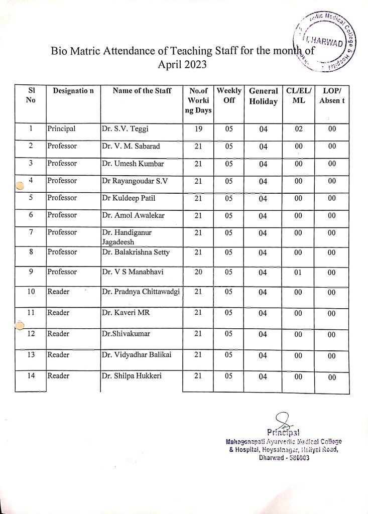 Teaching staff attendance report for the month of April 2023